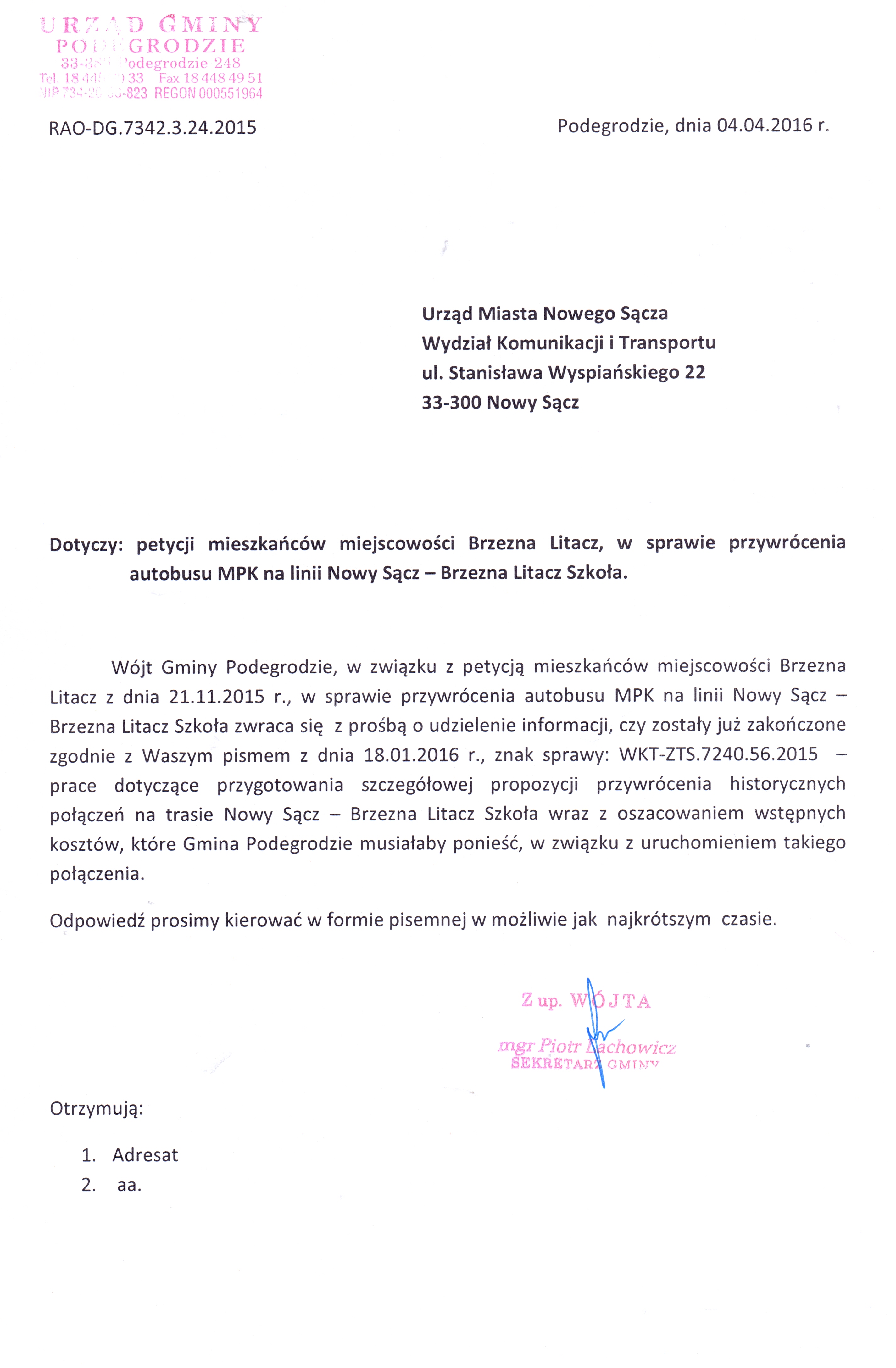 - Pismo Wójta Gminy Podegrodzie (znak sprawy RAO-DG.7342.3.24.2015) z dnia 04.04.2016r. skierowane do Urzędu Miasta Nowego Sącza w sprawie udzielenia informacji dotyczących przygotowania propozycji historycznych połączeń na trasie Nowy Sacz - Brzezna Litacz Szkoła wraz z oszacowaniem kosztów